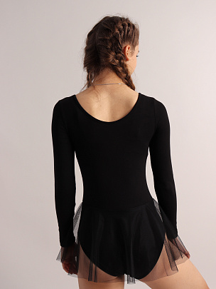 Купальник с длинным рукавом и с юбкой из сетки в цвет основного полотна. Вырез горловины и проймы ножек окантованы бейкой из основного полотна.
