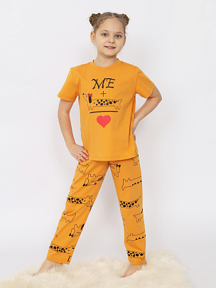 Пижама гладкокрашенная из футболки и брюк. Футболка свободного покроя с коротким рукавом. Горловина обработана притачной бейкой из рибаны с лайкрой. Перед оформлен принтом. Прямые брюки умеренного объёма выполнены из полотна дополнительного цвета. Цельнокроенный пояс обработан плоским швом вподгибку с одновременным прокладыванием резинки.
