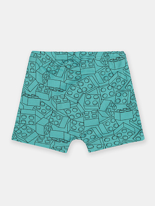 Трусы-боксеры из набивного полотна. Верхние и нижние срезы обработаны плоским швом вподгибку. По верху одновременно проложена резинка. Швы притачивания вставки и ластовицы спереди оформлены декоративной строчкой с застилом в цвет полотна. Посередине верхнего края переда настрочена декоративная этикетка.