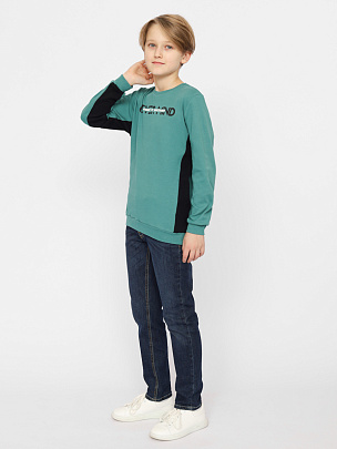 Джемпер для мальчика с контрастными вставками вдоль боковых швов и по рукавам. Рукава с манжетами по низу. Горловина круглая, обработана узким воротником из полотна с эластаном. Перед джемпера декорирован принтом.