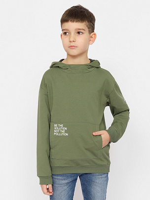 Толстовка для мальчика с капюшоном и карманом "кенгуру" спереди. Капюшон с подкладкой. Рукава длинные, с манжетами по низу. Низ изделия оформлен притачным поясом. Пояс и манжеты выполнены из полотна с эластаном. На левый рукав настрочена жаккардовая этикетка, на карман нанесен принт.