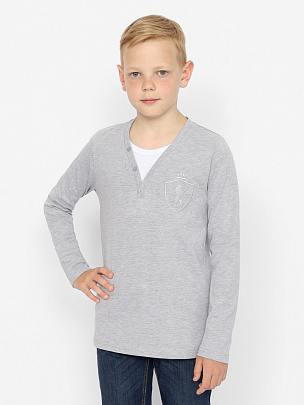 Джемпер с длинным втачным рукавом. Воротник с вырезом и имитацией футболки, по краю ланки воротника расположены декоративные пуговицы.