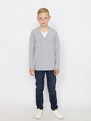 Джемпер с длинным втачным рукавом. Воротник с вырезом и имитацией футболки, по краю ланки воротника расположены декоративные пуговицы.