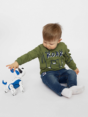 Джемпер для мальчика свободного силуэта с карманом спереди и притачным эластичным поясом по низу. Горловина круглая, обработана притачным воротником из полотна с эластаном. Рукава длинные с эластичными манжетами по низу. Перед джемпера декорирован принтом "Маленькие шаги приводят к большим переменам".