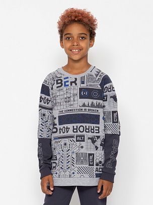 Джемпер с длинными втачными рукавами и притачными манжетами. Воротник, манжеты и пояс выполнены из полотна с эластаном. Перед декорирован принтом "Виртуальный мир без границ".