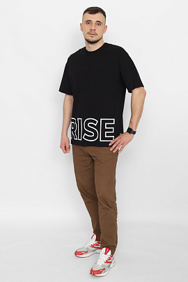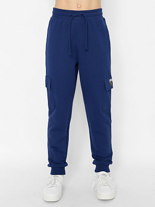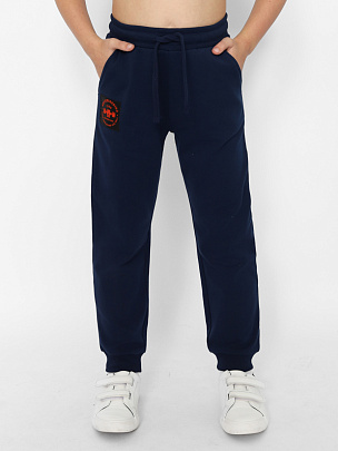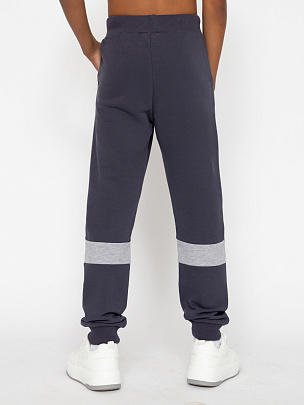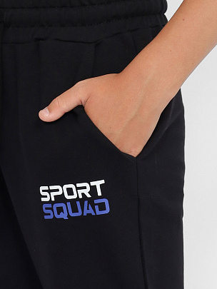 Брюки для мальчика с карманами. Пояс притачной, с резинкой и функциональным шнуром. Нижние срезы брюк на резинке. В области левого кармана небольшой принт "СПОРТИВНАЯ КОМАНДА"с эффектом высокой базы. Правая половинка брюк декорирована принтом.