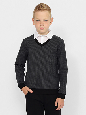 Джемпер для девочки с длинными рукавами и отложным воротником. Рукава из сетки с манжетами из кулирки. Полочка двойная - нижний слой из кулирки, верхний из сетки. Сзади застежка на пуговицу.