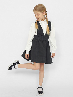 Сарафан школьный для девочки из футера, с оригинальным V-образным вырезом на груди. Сарафан школьный для девочки имеет красивые переплеты лямок, легко сочетается с блузой, лонгсливом, водолазкой. Сзади застежка на пуговицы.