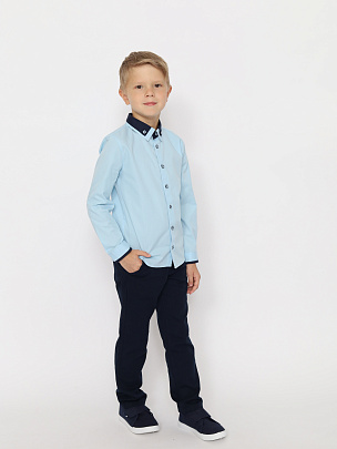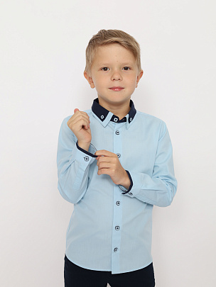 Рубашка классическая, полуприталенного силуэта, с длинным рукавом рубашечного покроя, с притачными манжетами, с застегивающейся шлицей рукава. Воротник двойной, обтачной с притачной стойкой контрастного цвета и декоративными пуговицами. Манжет с отрезной планкой контрастного цвета.