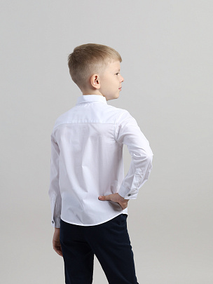 Рубашка классическая, полуприталенного силуэта, с длинным рукавом рубашечного покроя, с притачными манжетами, с застегивающейся шлицей рукава. Воротник обтачной с притачной стойкой. Планка оформлена декоративным кантом контрастного цвета.