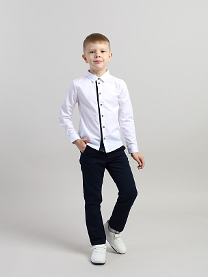 Рубашка классическая, полуприталенного силуэта, с длинным рукавом рубашечного покроя, с притачными манжетами, с застегивающейся шлицей рукава. Воротник обтачной с притачной стойкой. Планка оформлена декоративным кантом контрастного цвета.