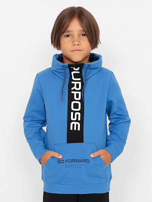 Толстовка с длинными рукавами и притачным поясом по низу. Манжеты и пояс выполнены из полотна с добавлением эластана. Перед с отрезной вставкой контрастноко цвета, которая переходит в воротник "Стойка". В нижней части переда расположен карман-кенгуру с декоративным принтом. Вставка переда декорирована принтом "ИДИ ВПЕРЕД. Брюки с притачным поясом и манжетами. В пояс вставлена резинка и функциональный шнур. Пояс и манжеты выполнены из полотна с эластаном.