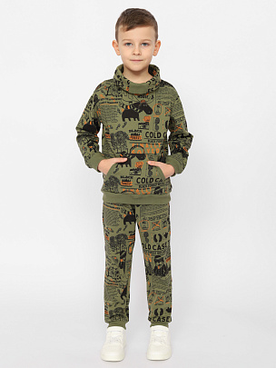 Толстовка с длинными втачными рукавами и манжетами из полотна с добавлением эластана. В нижней части толстовки расположена декоративная планка контрастного цвета. Капюшон с лицевой частью и декоративным принтом, шнурок декорирован вязаной нашивкой. Перед декорирован принтом "Панно" мир динозавров. Брюки с притачным поясом, манжетами и функциональными карманами. Пояс и манжеты выполнены из полотна с эластаном.