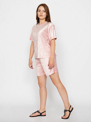 Костюм изготовлен из высококачественного бамбукового велюра. Футболка свободного силуэта с коротким рукавом, шорты свободного кроя с поясом на мягкой резинке. Ткань переливается и меняет оттенок в зависимости от освещения. Костюм женский подчеркнёт индивидуальность, привлекательность и нежность своей обладательницы.