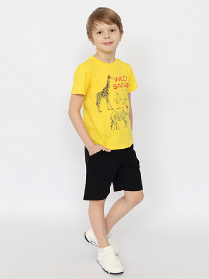 Футболка с коротким рукавом. Горловина круглая, обработана узким воротником из полотна с эластаном. Перед оформлен принтом.